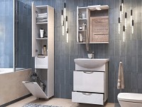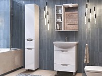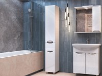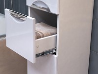 Модель оснащена встроенной бельевой корзиной, которая помогает поддерживать порядок, и полками для текстиля и косметики. Петли с доводчиком обеспечивают мягкое и бесшумное закрывание дверей. Глянцевые фасады с хромированными металлическими ручками подчеркивает современный дизайн мебели.