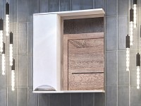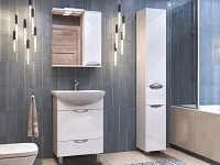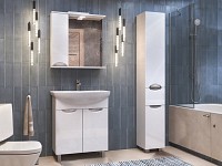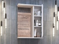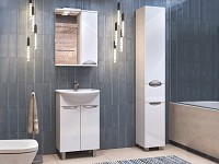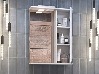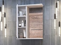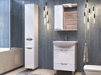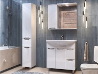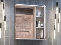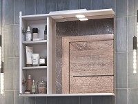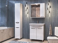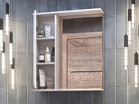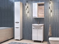 Глянцевый фасад с повышенной влагостойкостью гарантируют долговечность мебели. За распашной дверцей находится отделение с полками для косметики и аксессуаров. Хромированная металлическая ручка добавляет облику элегантности.