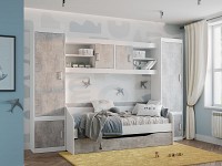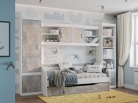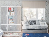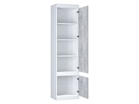 Внутри находится выдвижная поперечная штанга, которая помогает быстрее находить нужную вещь. Полки обеспечат место для коробок с обувью, головных уборов и других сезонных вещей. Матовые фасады имитируют текстуру бетона, что позволяет интегрировать модель в современный интерьер.